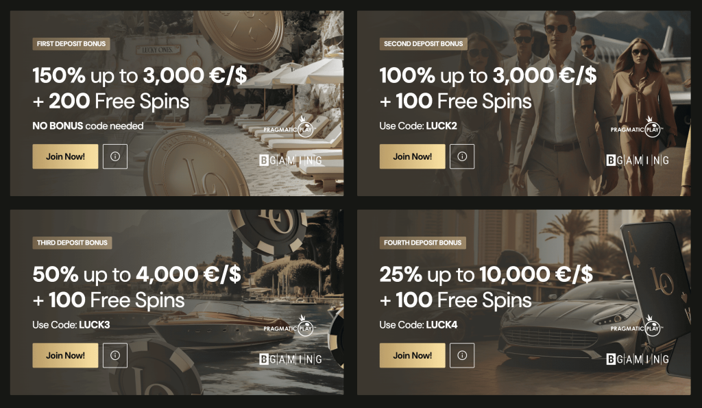 Australians’ first Lucky Ones Casino login comes with a 20,000 AUD bonus offer, which we spread over your first four deposits. Locals need 20 AUD to claim the varying deposit match percentage and a 40x wagering requirement to redeem cash. The following table shows details.